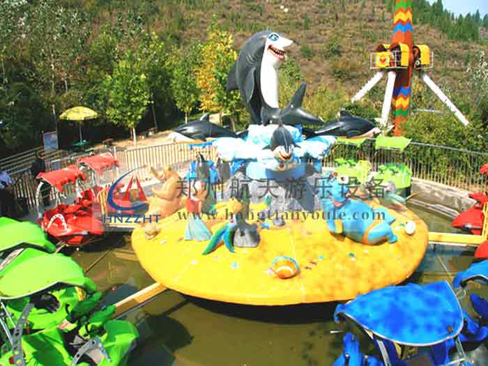 激战鲨鱼岛是郑州航天游乐设备厂研发的一种新型旋转类游乐设备,可乘坐16/24/36人。当设备开动时,游客一边乘坐会旋转的飞船,一边可用船上的水枪射击鲨鱼的各种造型,当目标被击中后,便会做出喷水,举手等各种动作,姿态可爱,趣味性强。而居正中的鲨鱼先生被射中后还会喷出水柱,向游客发出攻击,使游客更能全身心的投入,从中享受乐趣。