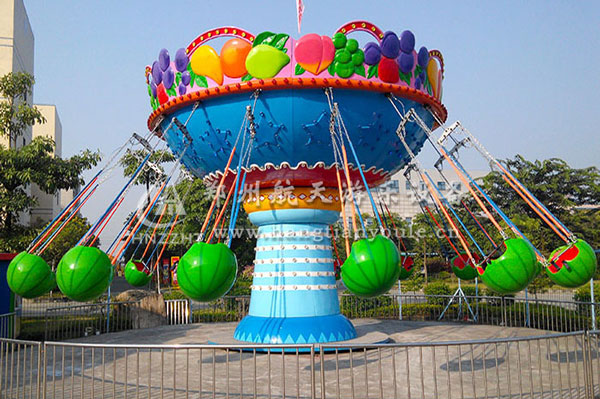水果飞椅,其靓丽的外表和充满刺激性的游戏形式很受大家的欢迎。外在的水果造型色彩鲜艳,栩栩如生更是让人驻足。设备顶部飞檐和中心柱玻璃钢均配有彩灯,在夜幕下更是美轮美奂。乘客乘坐在吊椅上能体验到飞翔的感觉,收获无比的快乐!水果飞椅备还配有精美的西瓜座舱,整体设计美观大方,设备周身配有五颜六色的灯光,极大的提升了设备的视觉效果和设备本身的吸引力!