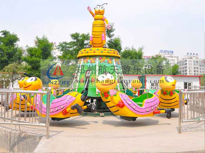 “旋转小蜜蜂”游乐设备是一款将旋转与升降完美结合在一起的游乐设备,该设备绕垂直轴中心旋转、升降自由的游乐设备并且游客可以自己控制升降的现代游乐设施,小蜜蜂围绕中心大蜜蜂旋转,并逐渐上升,游客在飞行中紧握操纵杆随意升降,互相追逐,使乘客在绝对安全的环境里尽情享受飞翔的快感和刺激,令人乐而忘返,该游乐设备不但性能优异,操作简单,而且有着新颖的造型、华丽迷人的彩灯装饰,深受广大游客的喜爱。