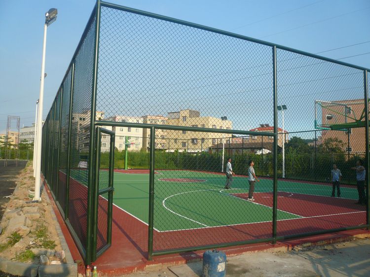 篮球场围网表面处理:围网采用PE/PVC包塑丝,立柱、边框采用喷塑、浸塑处理