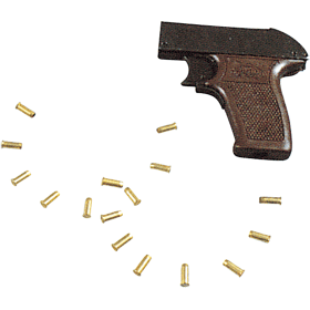 田径器材常用的双发发令枪: 1 发令枪击发令弹时应正常发火、弹壳不应有击穿、漏烟现象、能顺利退壳、击发后击发机构复位应灵活、使用安全。2 响声:正前方100 米处、声响值大于60 分贝以上。3 烟雾:正前方150 米处清晰可见。配用弹种:长、短发令弹均适用。弹堂体容弹量:2 粒、供弹方式:单粒手动、击发方式:单粒、产品净重:0.25kg.