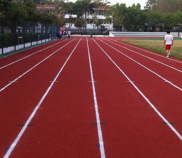 塑胶跑道工程铺装施工工艺是采用三步施工法进行铺装的。首先在胶液中加入适量的橡胶粒,摊铺底胶厚度为8毫米,待其固化后,在上面再铺装厚度为2毫米的胶液,用人工均匀地撒上红颗粒,回收多余胶粒,最后在上面喷一层胶液。工艺简图:清扫场地 → 底胶配料 → 混合搅拌 → 摊铺 → 消泡 → 固化 → 面胶配料 → 混合搅拌 → 摊铺→ 消泡 →撒颗粒→回收胶粒→ 滚胶→ 测量画线 → 检测点线 → 竣工