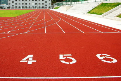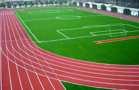 塑胶跑道工程铺装施工工艺是采用三步施工法进行铺装的。首先在胶液中加入适量的橡胶粒,摊铺底胶厚度为8毫米,待其固化后,在上面再铺装厚度为2毫米的胶液,用人工均匀地撒上红颗粒,回收多余胶粒,最后在上面喷一层胶液。工艺简图:清扫场地 → 底胶配料 → 混合搅拌 → 摊铺 → 消泡 → 固化 → 面胶配料 → 混合搅拌 → 摊铺→ 消泡 →撒颗粒→回收胶粒→ 滚胶→ 测量画线 → 检测点线 → 竣工