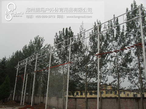 三、器材规格:总长10.3米,宽6米,高9-12米(可选择)。每角一根主力柱,共5根主力柱,主力柱材料直径180mm焊管,上下双横梁,直径114mm,上下横梁硬连接,保护点拉力是普通结构的2倍,同时方便教练在横梁上做保护站。保护钢丝直径16mm,两端压头处理,坚固无比,带收紧装置,教练随时可以收紧保护钢丝。脚蹬16毫米圆钢热折弯处理,弯头更圆润。外观防锈两次面漆两次,面漆采用丙烯酸聚氨酯油漆,耐候性强,不易脱粉。