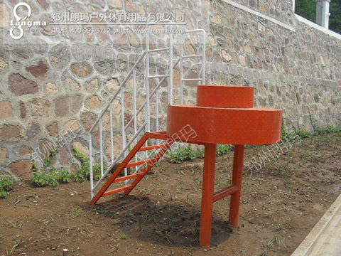 器材使用方法:两个学员面对面站立在两道钢丝上,同时手推着手,相互依靠着从器材的一端走到器材的另外一端。