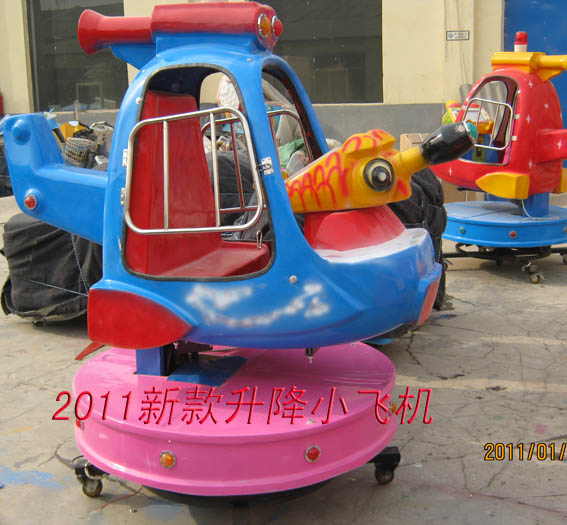 升降旋转小飞机,儿童乘坐在小飞机中,启动开关或者投币,飞机可以自动旋转,同时做匀速往复升降运动,伴随着优美动听的儿歌(可自行更换)及七彩灯光,令儿童流连忘返,播放器具有断电记忆播放功能,智能音乐无间断,自动循环播放,低失真,高品质,并设有计数功能,使管理更轻松,更方便。