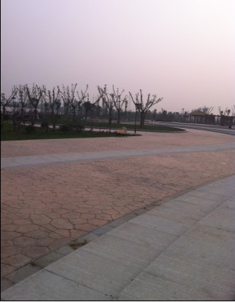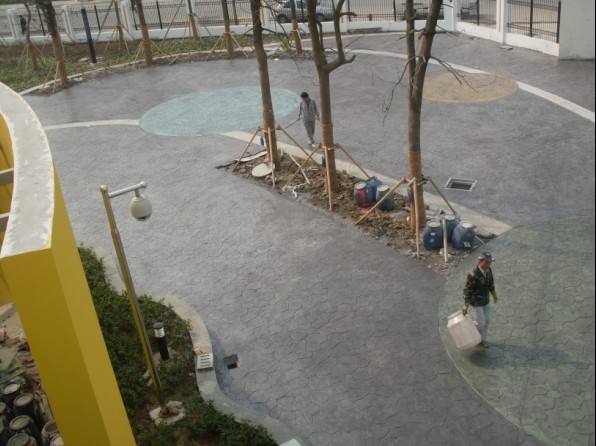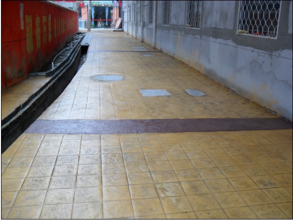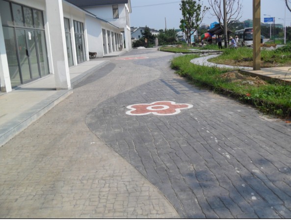 压模地坪路面工艺是在混凝土处于初凝阶段,铺洒上强化料(Color Hardener)、脱模粉(Release Agent),用专用成型模(Texture Mats)压入混凝土面层表面以形成各种仿天然的石纹和图案。高压冲洗并待混凝土面层干燥后,用专用工具将保护剂(Sealer)喷洒或涂刷在混凝土面层,这样,原本平凡普通的混凝土就会产生各种美观自然、色彩真实持久、质地坚固耐用的砖石、地板、大理石等丰富的纹理效果-压模路面。