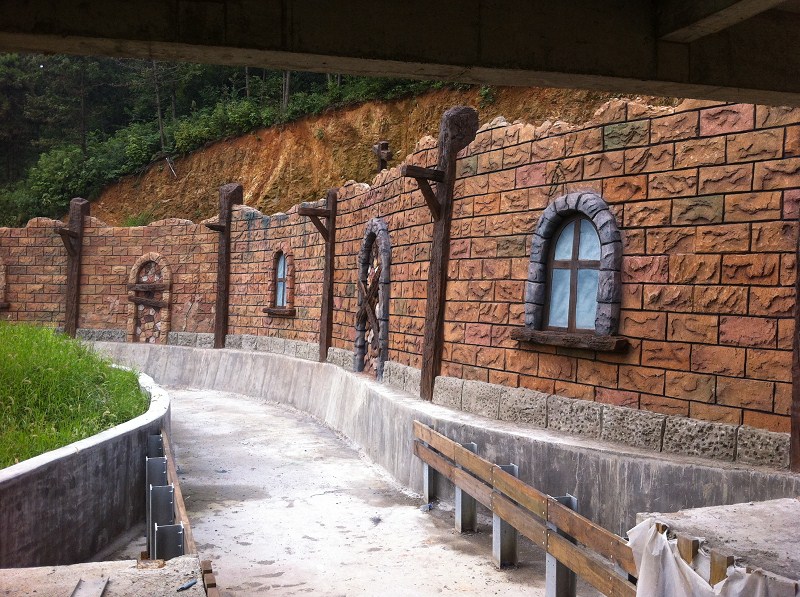 与传统的山水景观制作工艺相比,我们采用了计算机辅助设计和新型材料制作的模具使组装更简便、施工更快更灵活。且以水泥为基本原料的工程寿命达70年以年。我们事先设计制作好的模块,由工厂成批生产单体构件,再运至工程现场安装的做法,比传统以人工现场雕塑制作的景观,色彩更均匀牢固持久,效果更逼真自然,且用工节省,在有限的造价内却更能保证工程质量,实现设计师的意图。