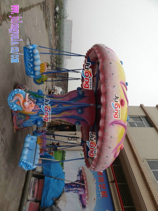 [水母飞椅]是许昌巨龙游乐设备有限公司研发生产的一款新型的旋转飞椅类儿童游乐设备,有6个座舱,可乘坐12名儿童。此设备造型独特、光彩夺目,特别吸引眼球。它以海洋色系为主基调,整个设备的风格别出心裁的采用一个整体的水母造型,座舱是由各种各样的海洋生物造型组成,当设备启动,远远望去,犹如一个巨型的水母在翩翩起舞。小朋友们坐在造型别致的海洋生物上面,随着设备慢慢旋转,加上动听的音乐,仿佛是跟随水母精灵在海底漫步。在旁边围观的小朋友看着也是醉了,个个都是摩拳擦掌、跃跃欲试。此设备一经推出,就受到了广大客户与游客的青睐,效益异常火爆。在多个万达广场都有安装。火热抢购中!欢迎您的订购、咨询:QQ:2189241838 13938908985