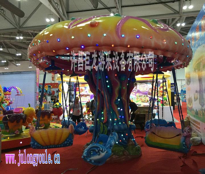 水母飞椅是一款新型的游乐设备,此设备造型独特、光彩夺目,特别吸引眼球。它以海洋色系为主基调,整个设备的风格别出心裁的采用一个整体的水母造型,座舱是由各种各样的海洋生物造型组成,当设备启动,远远望去,犹如一个巨型的水母在翩翩起舞。小朋友们坐在造型别致的海洋生物上面,随着设备慢慢旋转,配上动听的音乐,仿佛是跟随水母精灵在海底漫步。在旁边围观的小朋友看着也是醉了,个个都是摩拳擦掌、跃跃欲试。此设备一经推出,就受到了广大客户与游客的青睐,效益异常火爆。在多个万达广场都有安装。火热抢购中!欲定从速!