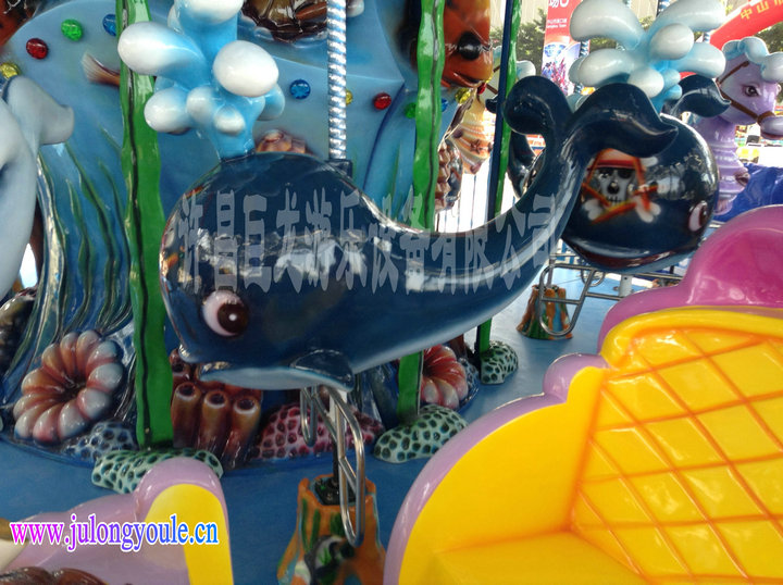 “海洋世界转马”中心主体及回转部分全部采用钢构架结构,机械运转采用中心齿轮上传动结构;中心主体和上围部分采用玻璃钢装饰,配有可自动闪烁的多色彩灯,乘椅采用海马、鲸鱼、贝壳车造型,其做工精细,光滑美观,颜色绚丽;设备运行时还配有优美动听的音乐(可插接U盘,随意更换音乐);开启后恰似“海底世界遨游”,引发无限童趣,可谓其乐无穷。