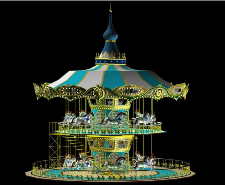 豪华双层转马拥有富丽堂皇的外观,精美华丽的装饰内涵,磅礴的气势、绚丽的灯饰和高贵典雅的造型,犹如一顶旋转的皇冠。当上、下层旋盘正反方向旋转的时候,游客乘坐在色彩斑斓、形态各异的木马上奔腾跳跃、四蹄生辉,仿佛置身仙境般的童话世界,犹如驰骋在草原,瞬间的梦想由此开始向无穷的天际放飞。