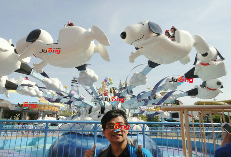 “飞天史努比”是许昌巨龙游乐设备有限公司利用自控飞机原理,结合系列电影《史努比》元素,开发的一款新型游乐项目。它运用人们对狗的喜爱,开发出人们梦想的飞天神犬;旋转的史努比会带着你飞上天空,通过里面的控制装置,每个人可以控制史努比飞行的高低。简直是超梦幻、超赞。