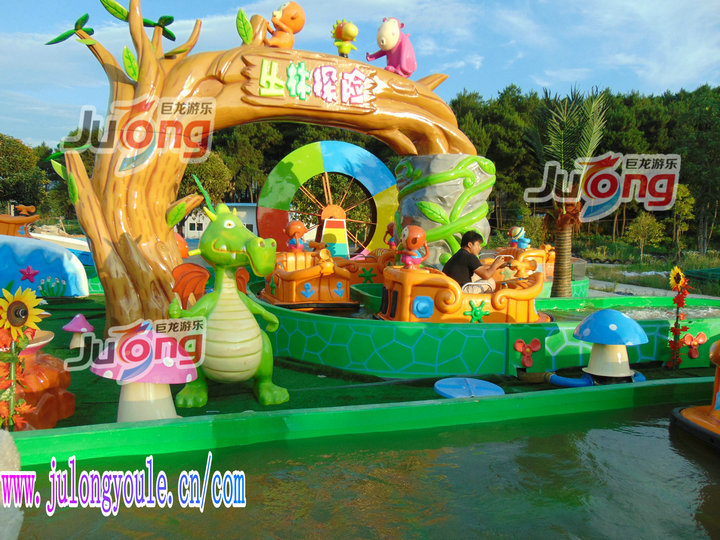 丛林探险是一款新型的儿童漂流项目。是许昌巨龙游乐设备有限公司在花果山漂流的基础上研发的一款新型游乐设施,游客手持激光枪乘坐木筏状的漂流船进入热带丛林。场景中有很多可爱的动物,游客可以通过激光枪射击靶点,使动物们做出各种可爱搞怪的动作。整个项目参与性、互动性极强,玩起来有一点点小刺激,却又妙趣横生!