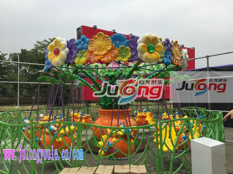 旋转小蜜蜂备在上面如同变身小蜜蜂在花丛中采蜜,非常有特色,以田园风光为特色,融入了花木、蔬菜等特征特色,以绿色的藤枝为主干,座舱上面有小蜜蜂和花朵点缀,非常给小朋友带来快乐的心情。旋转小蜜蜂儿童飞椅游乐设备的出现将会为儿童提供一个锻炼胆量的平台,在运行着的迷你小飞椅上有种时刻被甩出的感觉,并且伴随有短暂的失重感,可以开发儿童的胆识。