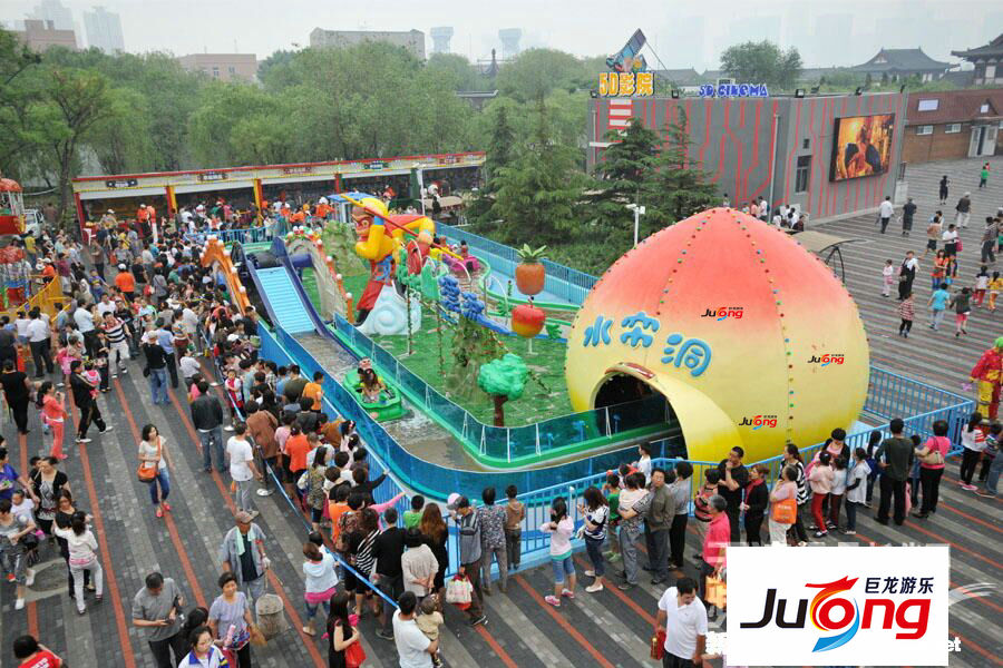 花果山漂流是巨龙游乐设备自主研发产品,4.18m的孙悟空巨型造型和逼真的大桃,各种互动的卡通造型,针对不同客户朋友需求,特别开发滑坡·双滑坡和平行漂流,水帘洞和小拱桥组成的滑坡极具趣味性。炫彩颜色搭配,国标钢材配置,九层厚玻璃钢铸就巨龙游乐别具一格“金刚”品质。