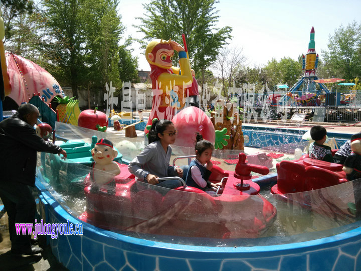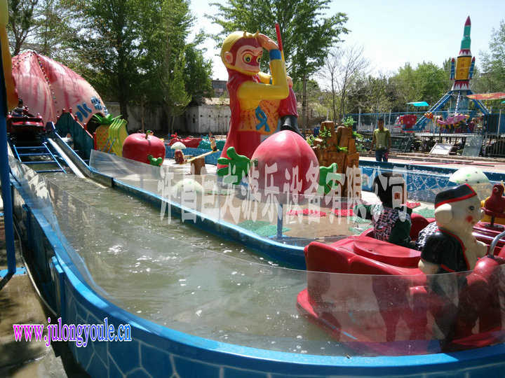 花果山漂流果果漂流让孩子在玩耍的过程中体会神话世界的详细描述:产品名称:ξ花果山漂流ξ(又叫果果漂流) 生产厂家:许昌巨龙游乐设备有限公司详细介绍:花果山漂流是一种新型儿童水上漂流类的游乐设备,又称果果漂流。此款设备是巨龙游乐设备的主打产品,花果山漂流占地约300平米(可根据实际地形定做)。此套设备的标准配置是八条船,共可乘坐16名乘客,有平行类和爬坡类两种规格可供选择。“花果山漂流”利用周边水系组成环形水上漂流,长达52米的曲型水道可供游客漂流,使游客畅享漂流的乐趣。ξ花果山漂流ξ的设计基础是《西游记》中的神话形象“齐天大圣孙悟空”及“花果山水帘洞”,孙悟空高达4.28m,而水帘洞高度可达10米高,设备内部建筑在充分保留了神话人物原型的同时融入了大量现代的元素风格,可谓是融贯今古。而建筑的造型则选用了巨型苹果、巨型香蕉、巨型蜜桃的外在形象,色彩丰富诱人,色泽明丽清新。所有的“建筑”都带有红外线感应,游客可以在漂流的同时按电钮玩游戏,只要打中目标的靶心,就会出现相关的场景。比如打中孙悟空,猴哥就会吐云吐雾、大闹天宫;打中假山,假山会喷水;打中巨型香蕉下的猪八戒会上下跳动。该设备充满了神话色彩,寓教于乐,益智童趣,是一款不可多得的趣味性极高的游乐设备,一进入市场就得到了众多游客的青睐!