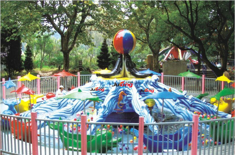 许昌巨龙游乐设备有限公司自主生产的水上游乐设备“海豚戏水”是一种旋转类游乐设备,乘员24人,也可根据客户场地的大小及需要设计制造。“海豚戏水”整套设备以受人喜爱的海洋动物“海豚”为模型,设计出海豚座舱,三豚戏珠等模型景观,并且配合各种小型海洋生物使得设备在外观上更具吸引力。设备启动后游客乘坐在海豚船上随着设备轨迹旋转,还可以利用船上配备的小鱼网打捞水中漂浮流动的色彩鲜艳的小球,趣味性强。