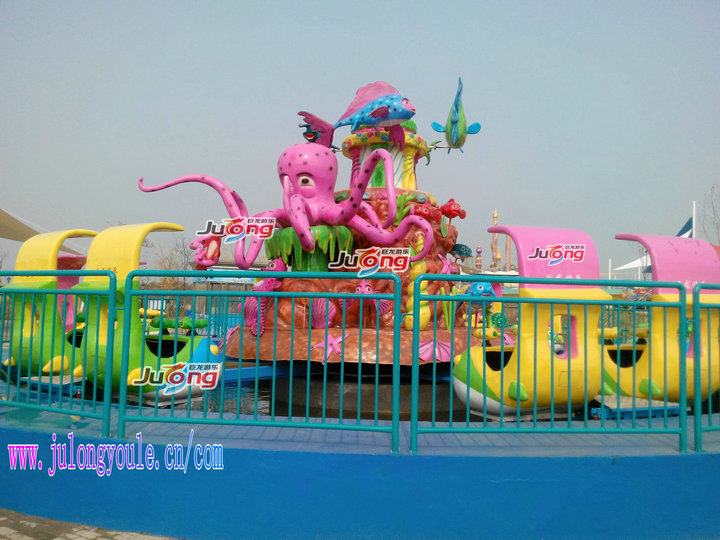 “欢乐海洋”就是巨龙设计部基于上面美妙的场景而开发出来的。是一种旋转类游乐设备,可乘坐24人。设备启动,游客一边乘坐会旋转的飞船,一边可用船上的水枪或者激光射击各个目标,当目标被击中后,便会做出喷水,举手等各种动作,姿态可爱,趣味性强。而位居正中的"八爪鱼”被射中后还会喷出水柱,向游客发起“还击”,大大增加了互动性,游客更能从中享受到欢乐海洋带来的欢乐。不过您也不用害怕章鱼先生的水珠会真的喷到游客身上,我们的座舱就是一个保护伞,保护着游客不被水柱喷到身上,八爪鱼喷水增加了游乐设备的趣味性和刺激性,使更多的游客玩了还想玩。该设备是一款水上旋转类游乐设备,外观色彩鲜艳,造型逼真可爱,是许昌巨龙游乐的一大亮色产品,极其吸引人的目光。