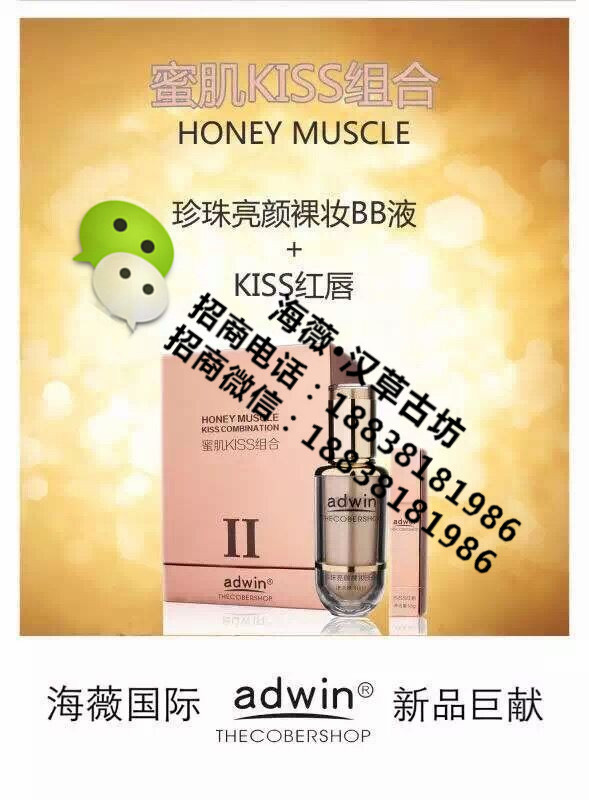 海薇国际新产品上市,爱迪薇蜜肌KISS组合(爱迪薇BB液和口红)爱迪薇BB液12小时不脱妆,六大功效,完美遮瑕,有效防晒,深层隔离,淡化细纹,深层保湿,持久定妆,打造完美妆容夏季是你最好的选择。