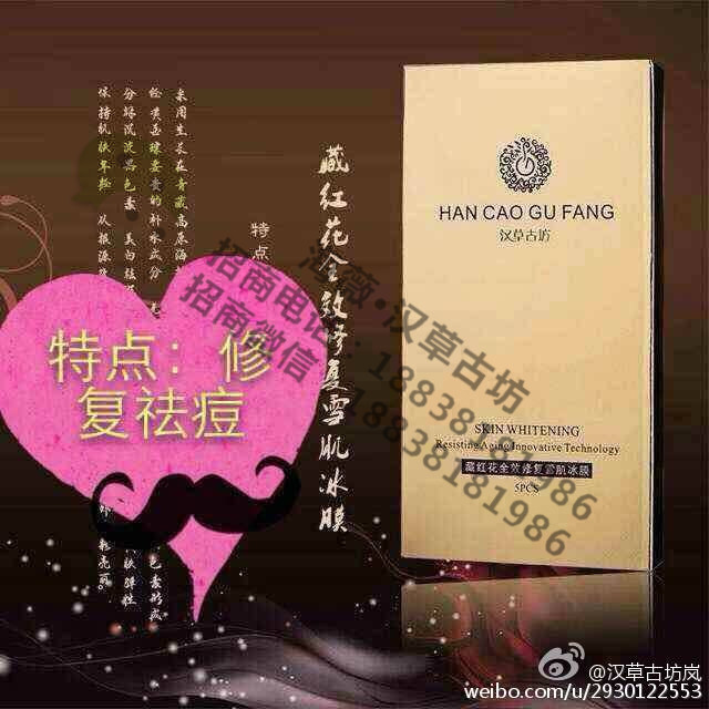 汉草古坊汉草古坊分四种汉草古坊的功用、1.雪莲花保湿:通过高科技手段,经历多到繁琐工序,从珍贵稀有百草之王雪莲花中,萃取出可延缓肌肤衰老的成分。这些成分具有强效的活血通络,防止肌肤衰老功效,质地清爽不油腻,吸收迅速,另因缺水而干燥;紧绷敏感的肌肤恢复光滑,柔软,健康有弹性,使肌肤感觉滋润、舒适、不紧绷。2、藏红花修复冰膜:比还要贵的补水成分,无毒无污染,消除自由基抑制黑色素形成,分解沉淀黑色素,美白、延缓衰老,去除皱纹,提高皮肤弹性,保护肌肤年轻。3、光甘草3D御白:是最具有美白功效的一种成分,被誉为“美白”是目前公认的疗效最好,有效仰止抑制黑色素生成,同时还具有防止皮肤粗糙和抗炎,抗菌的功效。4 、七白汉方净白:经历多种繁琐工序,从七白系列本草中萃取出的本草弹力水营养活性因子,汗草亮白活性因子与皮肤接触的瞬间,渗入肌肤深层,作用于皮肤变黑过程的每一步,从而获得完善的润白,亮白净白三重功效,立体解决色斑问题,缔造净白无瑕的肌肤。号:18838181986或QQ1203716677
