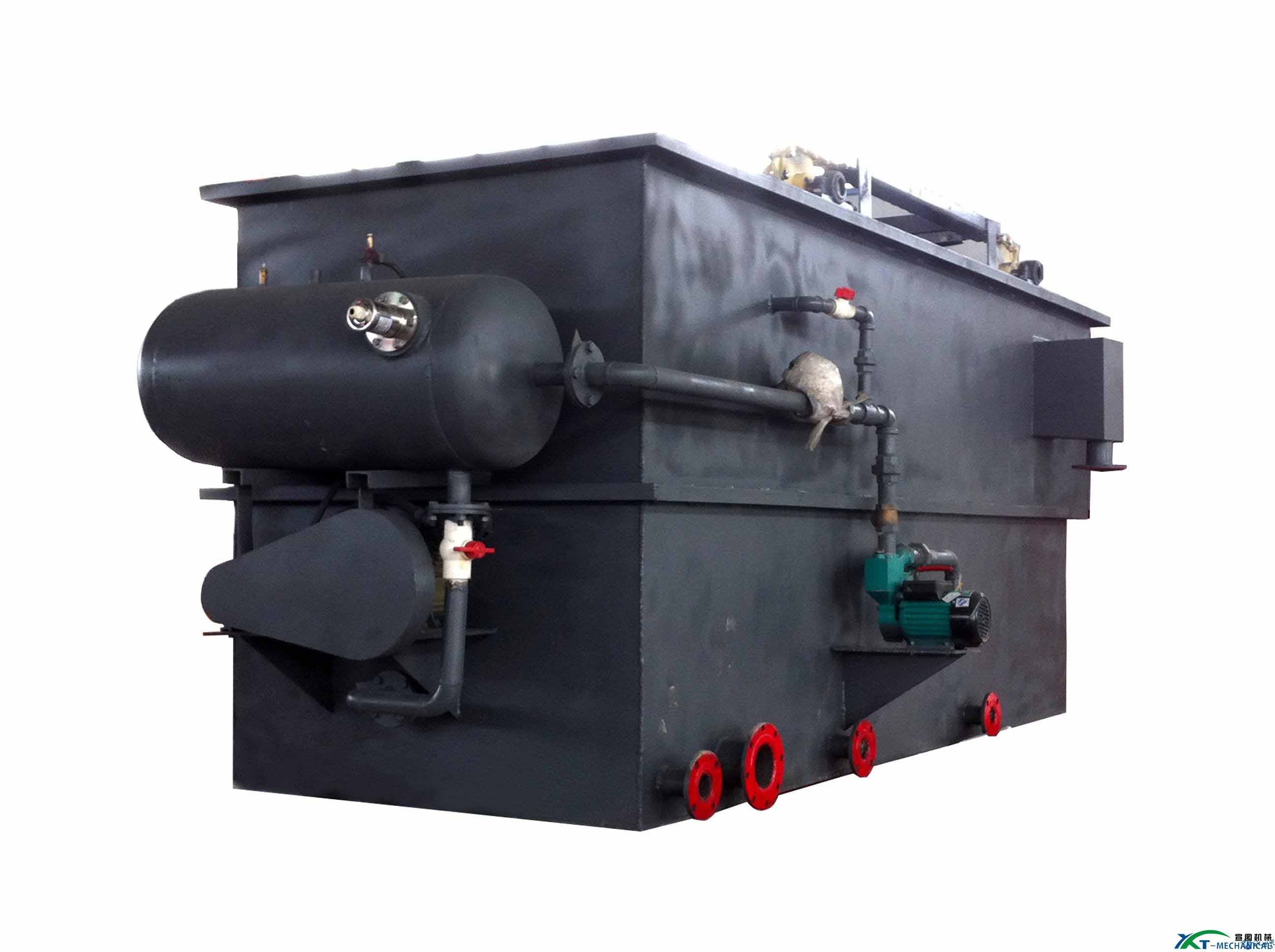 溶气罐产生溶气水,溶气水通过释放管进入待处理的水中,小气泡缓慢上升并粘附于杂质颗粒上,形成比重小于水的浮体,上浮水面,形成浮渣,然后由刮渣机将浮渣去除,比水比重大下沉到沉淀椎体内,间歇性排放到污泥池。