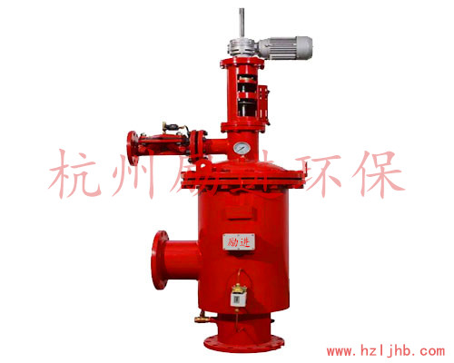 原水由进水口1进入过滤器,经粗滤网2较大的颗粒杂质,进入精滤网3,过滤后净水由出水口7流出。此过程中,原水中的杂质不断在滤网表面积累。致使过滤器出、入口间形成了一个压差△P,当此压差△P达到压差控制器4预设值时。自动清洗功能启动,排污阀6开启,在过滤器内压力与对大气的排污口间的压差作用下,滤网表面的杂质经吸咀9、集污轴8、排污腔由排污阀排出。在此过程中,由于电机驱动单元5带动集污轴及其吸咀在精滤网表面做螺旋扫描、吸物除污物,将整个滤网表面杂质清洗干净。清洗结束,排污阀关闭。电机驱动单元以及集污轴停止。一个清洗周期结束。