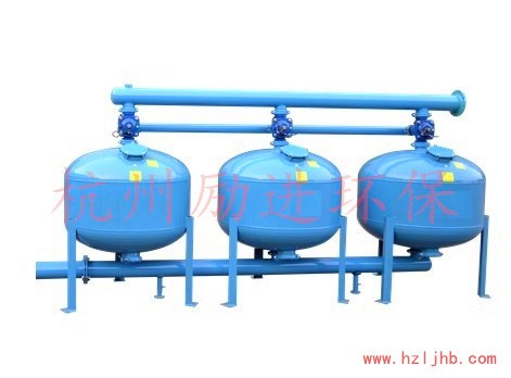 石英砂过滤器,过滤器内部填装精选石英砂等介质。可以去除原水中含有的泥沙、铁锈、胶体物质、悬浮物等杂质,系统可手动或全自动,能定期进行反冲洗、正洗等操作。反冲洗周期的设定根据原水水质的坏来考虑或根据压差决定,当压差0.05-0.1MPa,进行反冲洗,反冲洗度:12-15L//(㎡.s)。