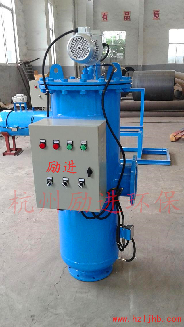 当水从底部进水口进入自清洗过滤器滤筒内部,杂质被拦截在过滤筒内壁,过滤后的干净水从出水口流出,当滤筒内壁的杂质越积越多时,自清洗过滤器进出口的压差达到预设值或达到清洗时间或手动预制时,过滤器将开始自清洗过程,整个自清洗过程包含两个步骤:打开位于自清洗过滤器上的自动排污阀;电机带动自清洗过滤器滤网内的清洗刷,被滤网所拦截下来的杂质从排污阀排出,清洗时系统不断流,自清洗过滤器的整个运行过程由随机配备的一个智能控制箱来控制。控制方式可选压差、时间、手动及PLC控制。