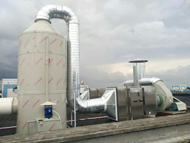 废气从塔体下方进气口进入喷淋塔,然后均匀地通过均流段上升到填料吸收段。在填
