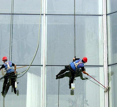外墙清洗根据不同建筑结构与墙面材质,针对污垢与物体表面结合力,选用专业外墙清洗剂和玻璃清洁剂,使用吊篮或吊绳,采用包括高压水枪、清洗机等设备进行施工操作。