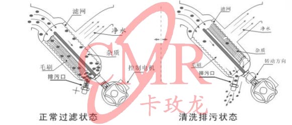 DDS-Y型电动刷式过滤器由优质碳钢筒体、高强度不锈钢滤网、控制电机、毛刷、压差表及电动排污阀组成。水流经过滤器时,杂质被不锈钢滤网拦截聚集到 Y 型滤室,而干净水流直接经主管通过。本机采用智能压差控制、定时控制自动清洗滤网。当过滤器进出口压差达设定值或定时器达到设定时间时,电动控制箱发出信号驱动电机转动,同时排污阀打开。吸咐在滤网上的杂质微粒被转动的清洗专用刷刷下,随水流从排污阀排出,当过滤器进出口压差恢复正常或定时器设定时间结束后,电机停止转动,电动排污阀关闭。整个过程中,物料不断流,实现了连续化、自动化生产。