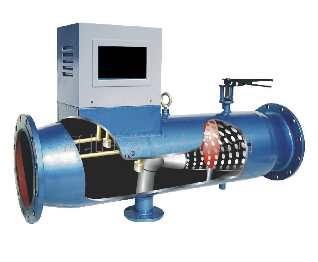 全自动反冲式过滤器主要有优质碳钢筒体,特殊结构的不锈钢契形滤网,蝶阀及排污装置所组成。当过滤器工作时,蝶阀处于开启状态,水流由入口进入过滤器,经过滤网过滤到出口。当过滤器需要排污时,关闭蝶阀,打开排污阀,水流经滤网前半段过滤,部分水流有出口流入系统,剩余水流由滤网后半段外侧流入内侧,经排污口排出,起到反向自动冲洗滤网的作用。整个冲洗过程系统可正常工作,无需停机