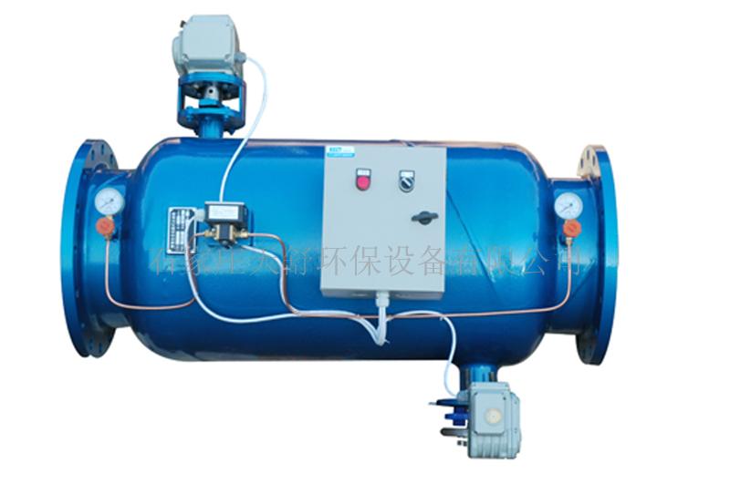 本过滤器主要由优质碳钢或不锈钢简体、特殊结构的不锈钢契形滤网、水流导向阀、差压控制器、电动控制箱及排污装置等所组成。当过滤器工作时,水流导向阀处于开启状态,水流由入口进入过滤器,经过滤网过滤后流入出口。本机采用压差控制、定位控制自动清洗滤网。当过滤器进出口差压达设定值或定时器达到预置时间时,电动控制箱发出信号,排污阀打开(水流导向阀处于开启状态),水流冲洗粘在滤网内壁上的杂志被进一步冲洗排出,当水流导向阀处于全关状态下,水流被迫从过滤器进口段网孔进入滤网外侧,大部分净液从出口流出,一部分净液又从滤网外侧进入滤网内部(因为系统会处于泄压状态,滤网内部压力小于外侧压力),从而对滤网进行反冲洗,特殊结构的不锈钢契形滤网使得在滤网内部产生了喷射效果,任何杂志都被从光滑的内壁上冲走。当过滤器进出口压差恢复正常或定时器设定时间结束后,电动排污阀关闭,水流导向阀开启。整个冲洗过程系统可正常工作,无需停机。