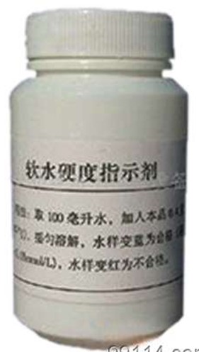 (约0.4克),摇匀,观察此水样的颜色,蓝色表示其为合格软水,红色表示硬度超标。