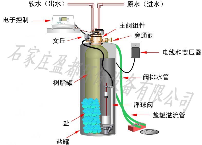 水的硬度主要由其中的阳离子:钙(Ca2+)、镁(Mg2+)离子构成。 当含有硬度的原水通过交换器的树脂层时,水中的钙、镁离子被树脂吸附,同时释放出钠离子,这样交换器内流出的水就是去掉了硬度离子的软化水,当树脂吸附钙、镁离子达到一定的饱和度后,出水的硬度增大,此时软水器会按照预定的程序自动进行失效树脂的再生工作,利用较高浓度的氯化钠溶液(盐水)通过树脂,使失效的树脂重新恢复至钠型树脂