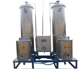 该设备由两个交换柱和两个盐罐组成,两组罐体在同一个架子上。当一组罐体产水,另一组罐体再生,从而实现24小时不间断产水。