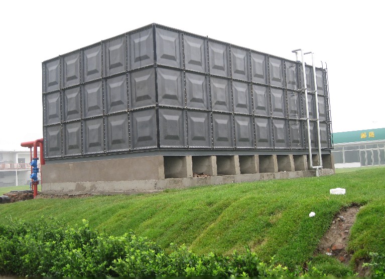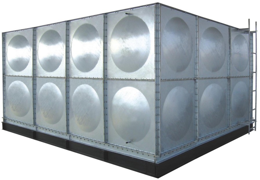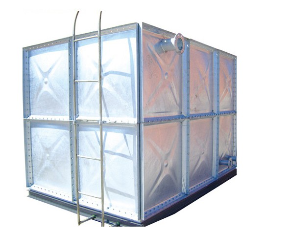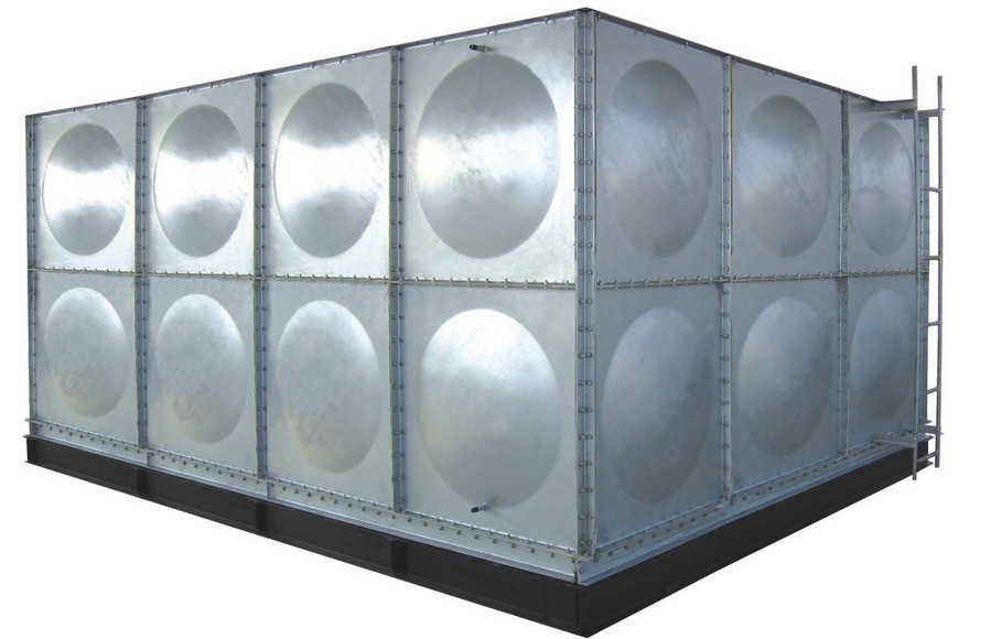 镀锌钢板水箱采用Q235钢板,冲压形成1000×1000和1000×500标准块,周边钻孔,经热镀锌处理,现场进行安装,组装时标准块之间夹无毒橡胶垫,螺栓连接。