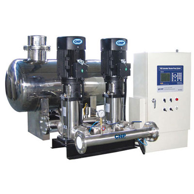 一体化成套供水设备,由电控柜、泵组、无负压罐、管路附件及压力罐组成。每台泵以并联方式接入系统。