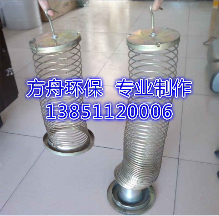 弹簧骨架(弹簧袋笼)是外滤式除尘器必备配套产品,它分有文氏管和无文氏管两种,弹簧骨架具有一定的伸缩性,因除尘器受室内空间的限制,除尘器的顶部没有一定的空间来更换除尘骨架,所以在设计时采用了弹簧骨架或(插接)多节式除尘骨架。