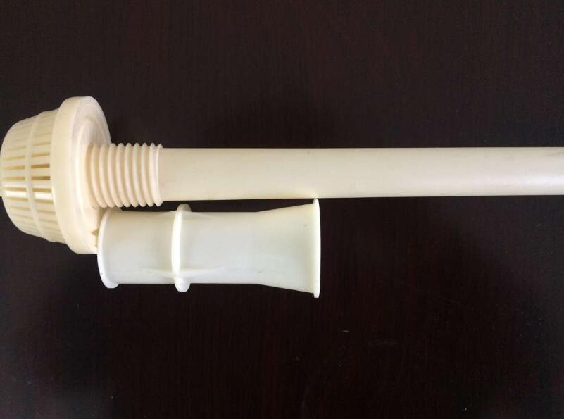 三番ABS滤头是由滤帽、滤柄、滤帽座及预埋件组成。滤帽上有许多狭缝构成气水混合通道,滤柄顶部与滤帽连成一体,中、上部有一至三个进气水小孔,靠近底部设有二到三个进气水狭缝,末端孔口可进水,因气水反冲洗使用的滤头滤柄较长(一般≧150mm),此种滤头又称长柄滤头。