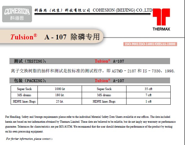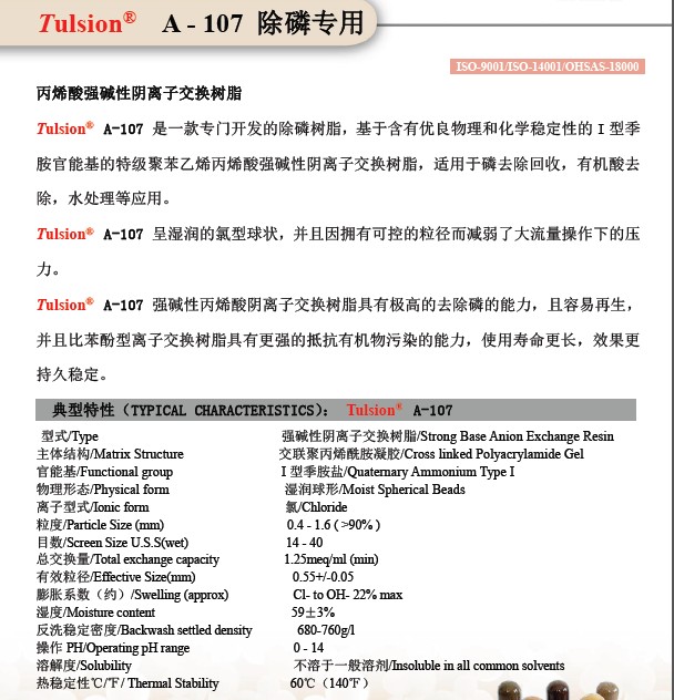 Tulsion A-107 是一款专门开发的,基于含有优良物理和化学稳定性的I 型季胺官能基的特级聚苯乙烯丙烯酸强碱性阴离子交换树脂,适用于磷酸盐去除,混床等应用。