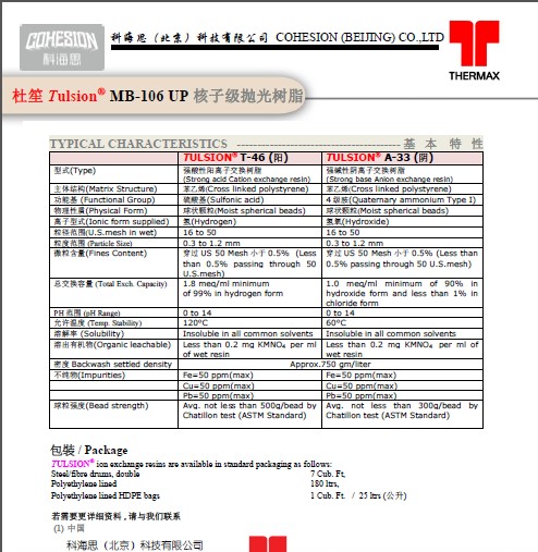 杜笙TULSION?MB-106 UP 是专门用于超纯水的最后段的抛光处理。杜笙TULSION?MB-106 UP适合用于电子产业 ,生产半导体及映像管产业等需要超纯水的行业。具有高的交换容量及优越的物理特性。