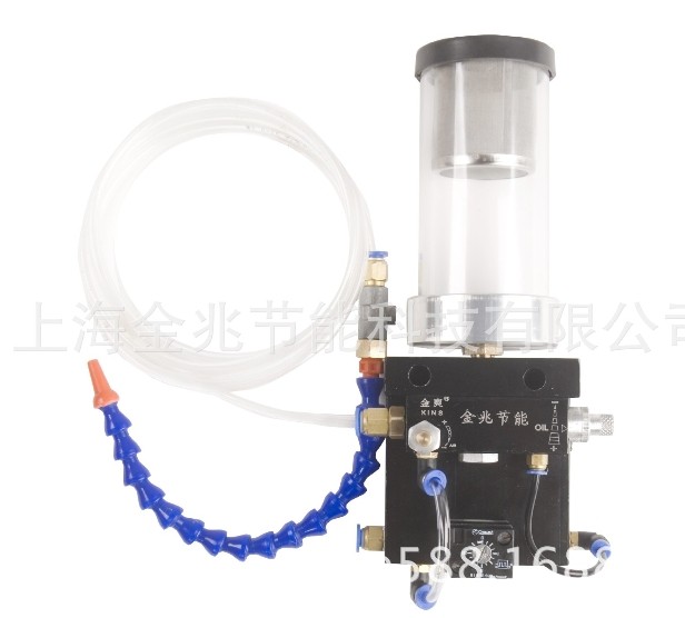 压缩空气通过过滤减压阀(选购件)后,由二位二通电磁阀来控制气源的开启(选购件),可实现与设备加工的同步进行。气动频率发生器用来控制气动精密微量油泵的工作,通入压缩空气后,气液增压活塞将油液压力增高排出,经混合喷嘴后由压缩空气带动喷至各润滑点。当频率发生器断开气源后,油泵柱塞依靠弹簧复位并完成吸油,等待下一工作循环。