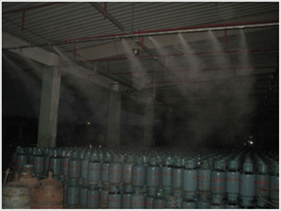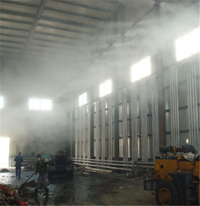 利用高压泵将经过水处理系统净化过的再加入消毒液的水加压至40公斤以上,经过高压管路传送至高压喷咀雾化,雾滴的直径仅为1-15μm,这些微小的雾化颗粒能长时间漂浮在空气中,因这些微雾因加入了消毒药,所以具有药性,能在每个空隙中蔓延,从而达到无死角全面消毒。又因为水雾是要蒸发成水蒸气的大家都知道水蒸发需要吸收热量,所以在夏季又可以很好的起到降温的效果。