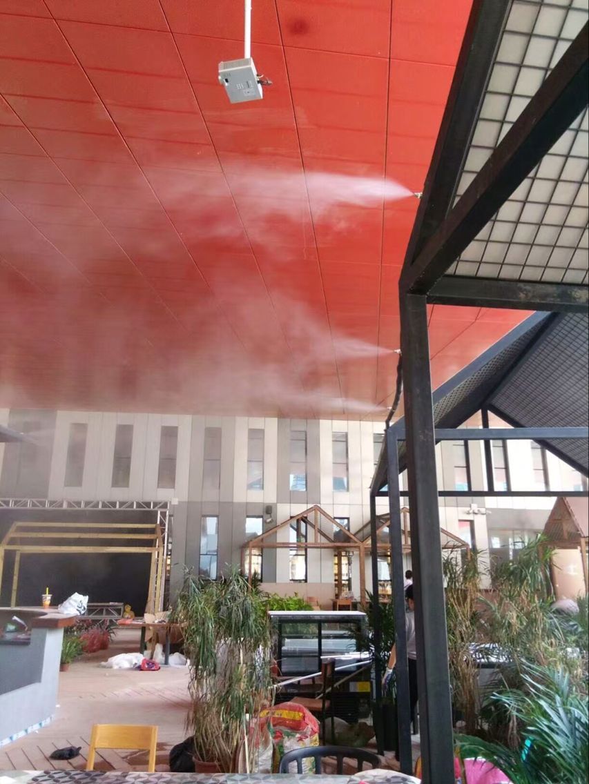 现在有了户外喷雾降温系统,就可以局部地控制大环境的温度。喷雾降温系统散发到空气中的水微粒,在气化的过程中要吸收大量周围环境中的热量,从而降低周围环境的温度,是防暑降温的有效手段。在盛夏,当城市气温达到35℃以上时,即使打着伞,戴着太阳镜,来自太阳的直射和来自地面的反射,依然让人感觉酷暑难当。而在喷雾降温系统的作用下,空气温度可降至25℃,在极端环境下可降温14℃,达到人体的温度,所以即使置身炎热室外,依然感到舒畅。