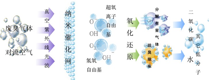 在光催化氧化反应中,通过紫外光照射在纳米TiO2光催化剂上产生电子-空穴对,与表面吸附的水份(H2O)和氧气(O2)反应生成氧化性很活波的氢氧自由基(OH-)和超氧离子自由基(O2-、0-)。能够把各种废臭气体如醛类、苯类、氨类、胺类、酚类、氮氧化物、硫化物、其它碳氢化合物及其它VOC类有机物在光催化氧化的作用下还原成二氧化碳(CO2)、水(H2O)以及其它无毒无害物质,去除异味的同时还可以起到消毒杀菌的功效,由于在光催化氧化反应过程中无任何添加剂,所以不会产生二次污染。