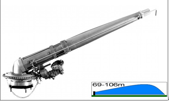 高仰角超大型喷枪,流量大,射程远,工作压力高,全圆或部分圆方式旋转,慢速回转,转速可调,可选用不同喷嘴,合金枪体,强度高,耐磨损,使用寿命长,操作方便,维护简单。水涡轮驱动稳定性强,抗风性能好,尤其适用于较大范围且堆场较高的工业除尘、移动灌溉及固定式灌溉,喷枪即使快速旋转也不会降低射程。