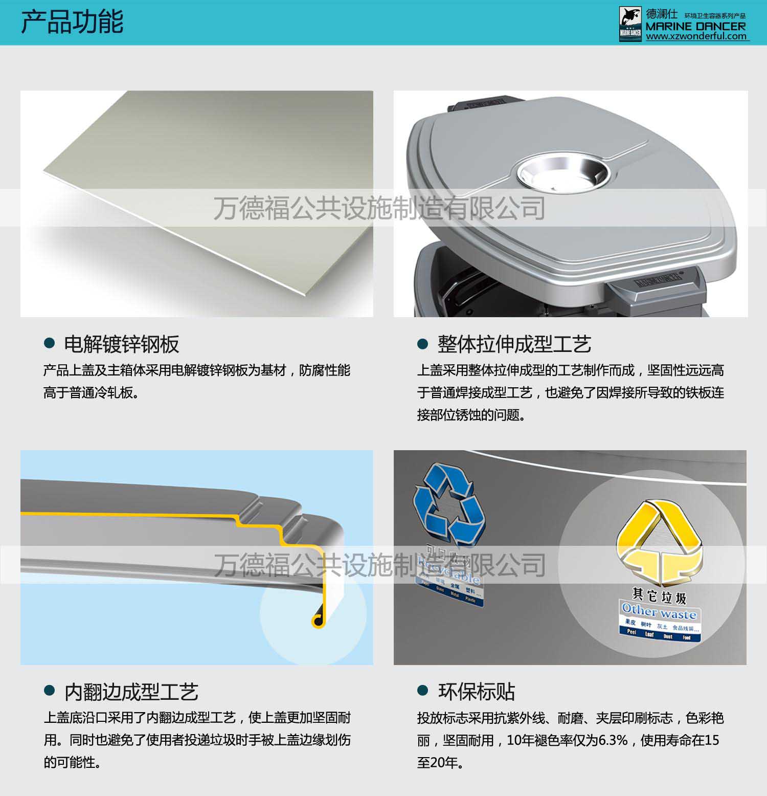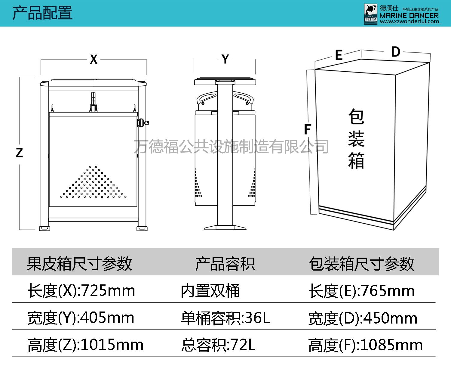 德澜仕品牌推出室外分类果皮箱,采用镀锌板材质,产品抗冲击性及耐腐蚀性极强,高于普通冷轧钢板,更适合户外环境。万德福厂家直销室外分类果皮箱,款式多样,价格合理,款式新颖,货源充足。垃圾桶参数:725*405*1015mm,室外分类果皮箱材质:镀锌板。