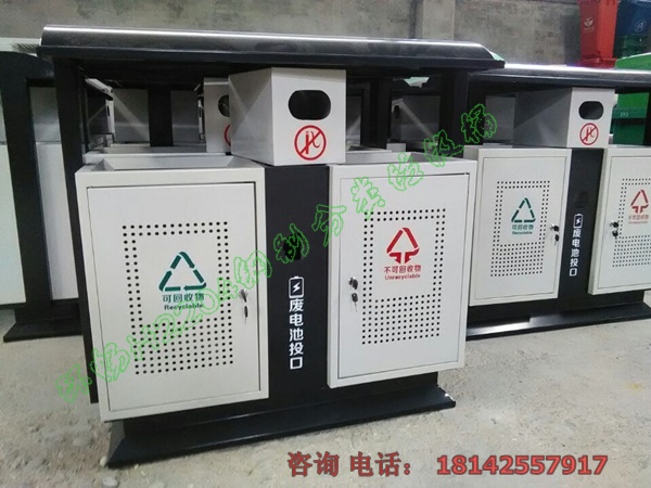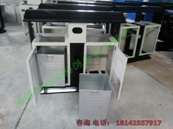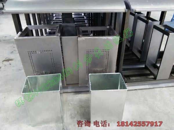 产品特点:用全钢结构,优质钢板,光滑无焊缝。桶身为数码冲孔钢板/喷塑钢板。适用于小区别墅、酒店、学校、政府工程及其它各类环保绿化工程! 产品参数:上盖配备有烟灰缸,方便吸烟人群的使用。框架的厚度为1.2CM,上开式的设计在垃圾倒取上更加的便捷。箱体采用的是冲孔压模的方式来设计,具有良好的透气性能效果,下面印刷有可回收垃圾和不可回收垃圾的分类,以便使用的过程中能较快的适应分类处理 。 内胆所用的材料是镀锌板,颜色无固定色,可根据您的要求订制]底座设置有安装孔,可用膨胀螺栓与地面有效固定,防盗性能良好;整个框架经酸洗磷化及除锈处理后进行静电喷涂,色泽亮丽,质感柔嫩。防紫外线照射退色,保证色彩鲜艳持久。最大程度的延长了产品生锈时间.